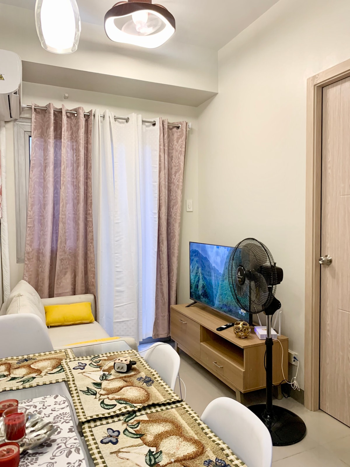 Includes: 3-seater dining table, induction cooker, refrigerator, microwave, rice cooker, electric cattle, basic tableware and cookware, smart TV (w/ Netflix and Youtube), wifi, 2-seat sofa, queen size bed, split type AC, extra mattress foam, bath towel and free essential kits, shower & Bath tub with heater.