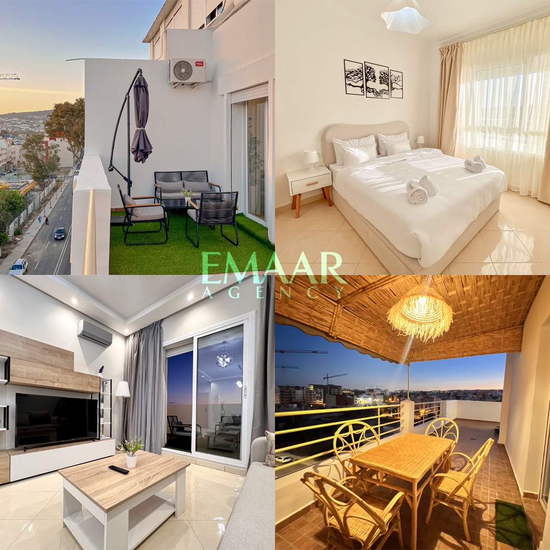 Profitez d'un séjour en famille inoubliable dans ce duplex à Tanger . situé à proximité de l'hôtel Farah,et au coeur de la zone Ghandouri à Tanger, cet appartement moderne offre une vue imprenable sur la mer et se trouve à quelques pas de nombreux cafés et restaurants animés. À l'intérieur, vous découvrirez un salon confortable pouvant accueillir jusqu'à 5 personnes, 2 chambres spacieuses, deux salles de bains, une cuisine entièrement équipée ,une buanderie et deux balcons pour admirer la vue.