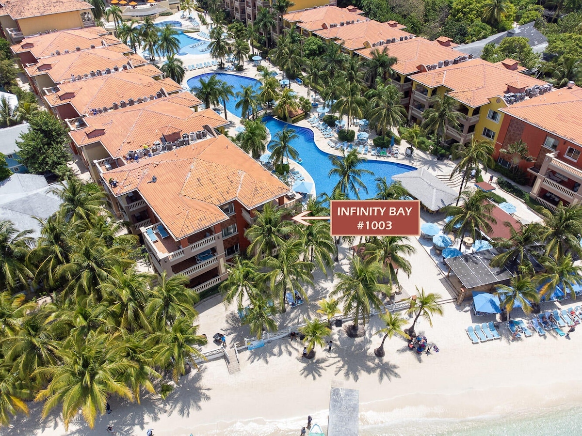 NO RESORT FEES!! Luxurious Infinity Bay Resort, on #1 ranked West Bay Beach-White sandy beaches & turquoise water. Spectacular Sunsets! Snorkel & scuba on the 2nd largest barrier reef in the world, just 25 ft away! Upscale, Spanish-style villa, with 2 balconies. Spa, dive shop, 2 infinity pools, jacuzzi, live entertainment nightly. Beach restaurant/bar & sports bar. All-inclusive options, full-size gym & breakfast buffets available, 30+ restaurants/bars on the beach, water taxis! No car needed!