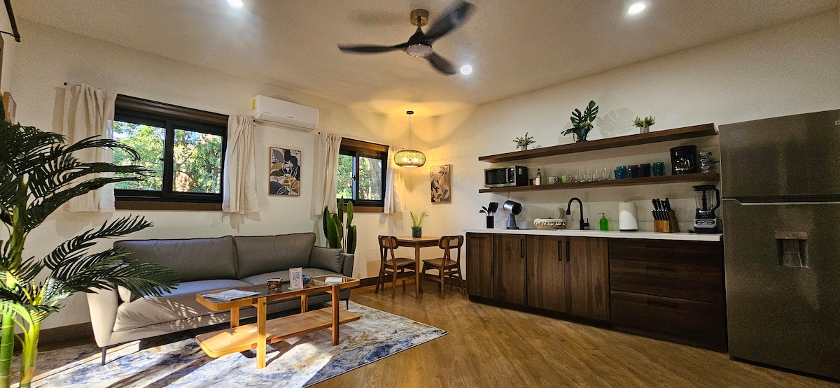 Located pool side this amazing space is a large open concept with vaulted ceilings. The suite has a queen size bed and a well-appointed bathroom. It features a full kitchen with all you’ll need for your stay. It has a spacious livingroom area, and a separate dining area. Spend your day at our infinity pool and hot tub surrounded by tropical forest and landscaping, just steps from the beach. . There are two 5 star restaurants directly below us on the beach for your dining convenience