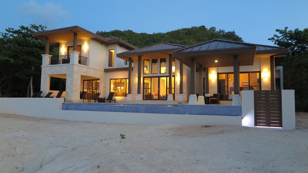Experience one of Roatan's Luxury homes located on one of the most pristine beaches in the world. Built in 2020 this masterpiece will put your soul at ease. Enjoy the modern style with designer touches and high-end finishes throughout. Ten foot ceilings and large windows cascade the natural light through the open floor plan that brings everyone together. This 3 bedroom 3 1/2 bath home has two additional studio's that are 1 bed 1 bath so there is plenty space for a large family or group.