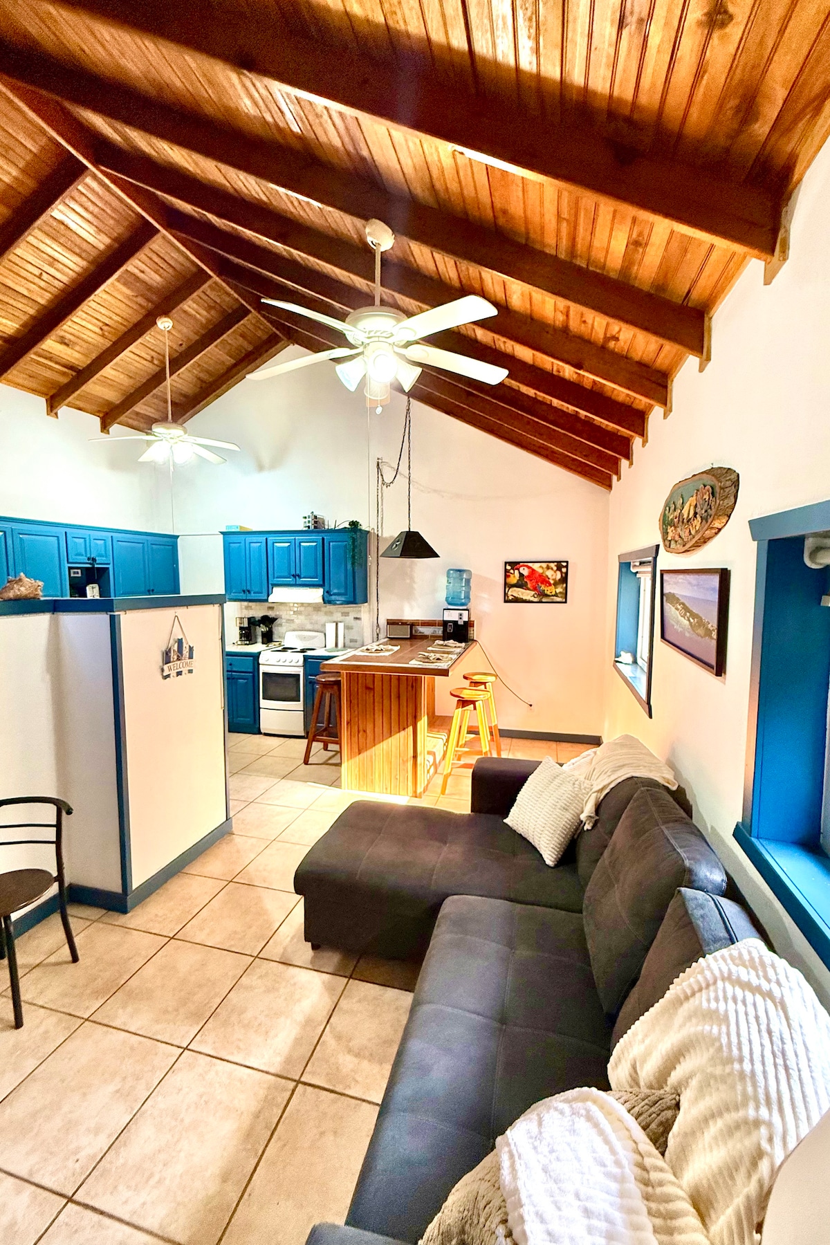 This cozy casita (studio) has a warm tropical feel. It's near the pool but not too close. It has a fully equipped kitchenette with everything you need to prepare meals and keep you're drinks cold. The bathroom has a large shower and plenty for room you to get ready for your night in West End. Sip on your morning coffee on your private deck and watch the wild macaws fly in for their morning visit. The lush jungle is all around you with the breezes to keep you cool while you relax in the hammock.