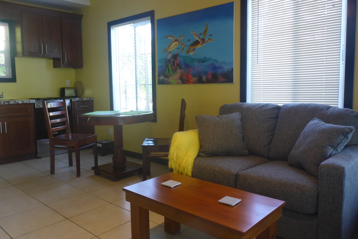 Studio conveniently located in an attractive, safe, residential community between West End and West Bay. Accessible by car, water taxi, & beach. Only 70 meters from uncrowded Turtle Beach, Clearwater Adventures - Roatan's top dive shop, The Boat Bar & several high-end bars/dining - all a 5-min walk on the beach! Snorkel & swim steps from shore. Comfortable room with a view of nature. WiFi, cable TV, AC, and free Roatan Disc Golf.