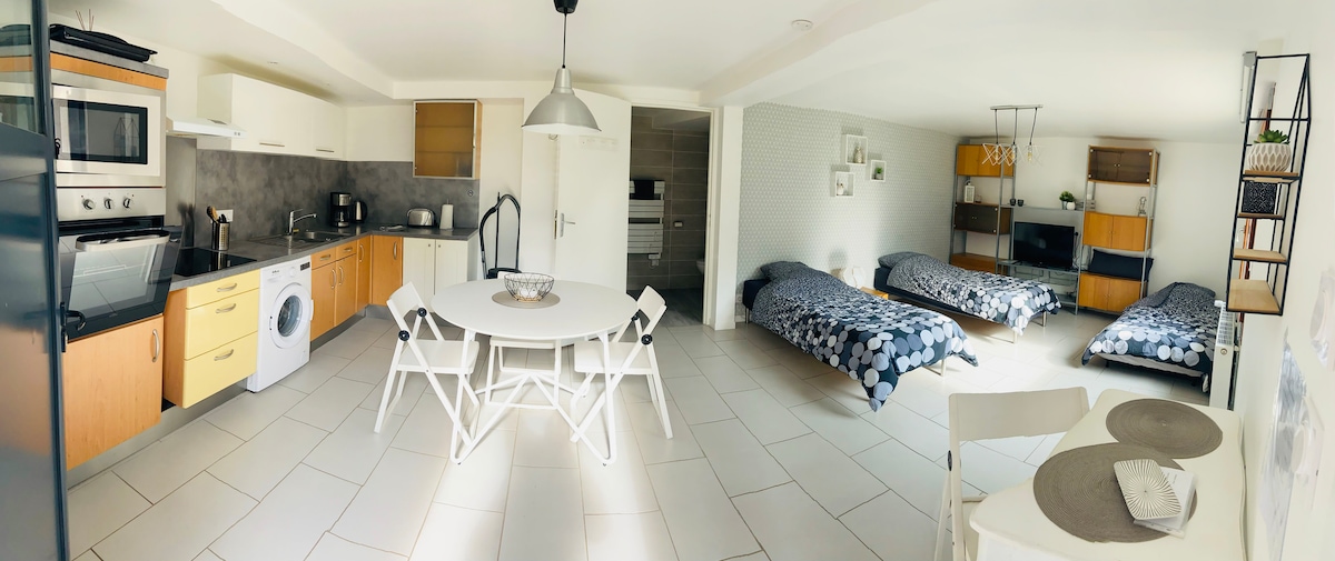 Bonjour, Je loue une dépendance mitoyenne entièrement rénové, comprenant à l'étage: une chambre avec un lit double, un salon avec un canapé lit. au rdc: une cuisine aménagée et équipée, une salle de bain avec une grande douche, wc séparé, une buanderie avec machine à laver et sèche linge. Vous résiderez dans un quartier calme avec un accès au bus C2 à 2 min , et métro à 10 min à pied. Commerces à proximités. Stationnement facile dans la rue.