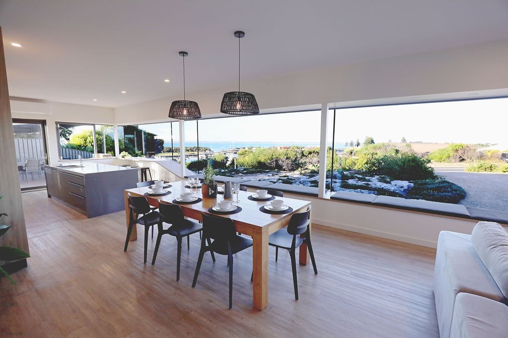 Perched high on a hill overlooking the harbour, the 180 degree views over Robe, will create a mesmerising backdrop to your relaxing getaway. Enjoy the view from your designer open-plan living space, with dining for 8 guests, a big comfy lounge, and a sunny window seat to read or dream.