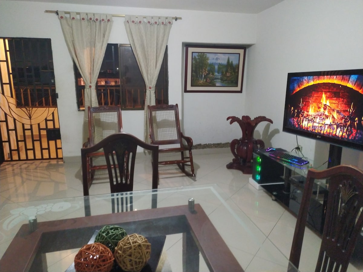 Disfruta de la sencillez de este alojamiento tranquilo y céntrico. Ubicado en un cuarto piso. Ofrece confort y tranquilidad, ubicado estratégicamente en el norte de la ciudad, frente de uno de los principales parques de la ciudad, restaurantes y supermercados. Cuenta con un colchón ortopédico tamaño queen, aire acondicionado, smart tv con base giratoria para que puedas ver tv desde la sala o desde el cuarto, cocina equipada lista para cocinar. EL AGUA DE LA DUCHA ES AL CLIMA.