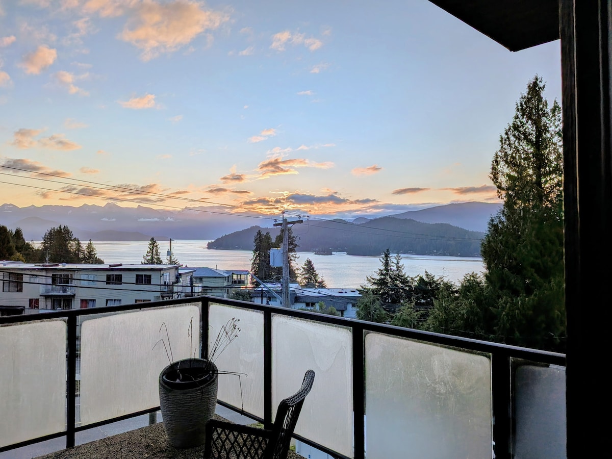 Modern NEW fully licensed H346845045 BC # RGA#202302. 2 bed,2 bath, private W/Dryer, workspace, High-speed internet. Walk to the Waterfront, Marina, beaches, Brew Pubs, Galleries, Shopping & Coffee Bars. Spacious sunny suite with 9' ceilings. Views to North Shore Mountains, Keats Island & beyond. Large private wrap-around deck to enjoy summer sunsets. - 4.96 rating Chef's kitchen, TV, Fireplace, Garden, Dog friendly! Games, toys, books for kids & adults