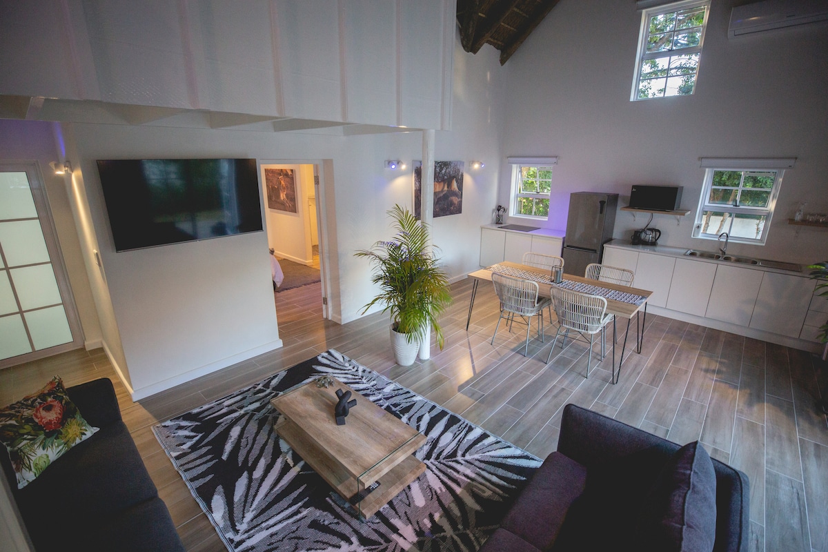 We welcome back Library after an 18 month sabbatical! Situated in the hub of the village, The Library is a place to roll-out life's simple pleasures. From the upstairs, open-plan living room taking in Franschhoek’s expansive views, the deep floating deck with its overstuffed beanbags, the size of the baths, to the Livingstone canvas hiding a flatscreen TV: all reflect the love of entertaining, travel and all things quirky and intriguing. This is village living at its best.