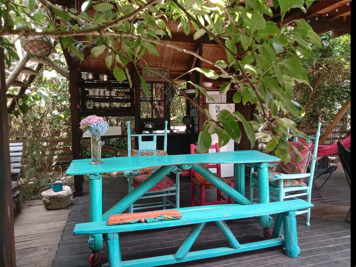 Domo en barrio el bosque, muy cerca de Playa Grande, rodeado de vegetación. Cuenta con baño con ducha y agua caliente y habitación en la cúpula del domo con cama doble y aire acondicionado. Además tiene una pequeña área de cocina con jarra eléctrica, frigobar y utensilios básicos. Es un espacio pequeño, cómo para pasar 2 noches o 3. La habitación es calurosa durante el día, el espacio para estar es un pequeño jardín, con hamacas paraguayas. Predio compartido con mi casa.