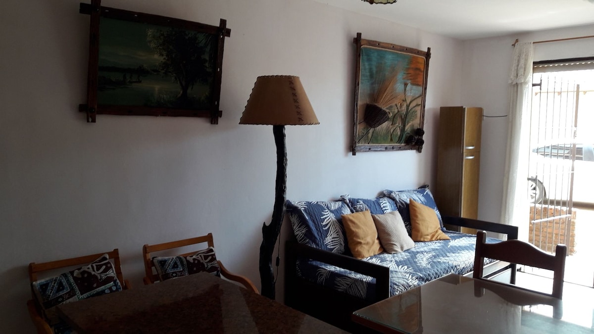 Moderno, funcional y confortable apartamento. Todo lo necesario para disfrutar de cómodas vacaciones. Terraza con parrillero y leña de cortesía. Hamaca. Lavarropas. Apartamento seguro. Posee alarma y rejas de seguridad. Medidas de seguridad para los mas pequeños. WI-Fi. Aire acondicionado en dormitorio. Estufa de alto rendimiento para pasar estadías en el invierno. En el dorm encontrarás cama matrimonial de 1.60x2.00. Estar sofá cama doble, para 2 personas +