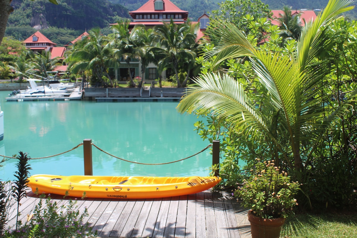 Luxury 4 bedroom house on Eden Island Come enjoy the tranquility and privacy of this four bedroom home all with en suite bathrooms in a secluded garden right in front of the marina water with a splash pool and beautiful views (max 8 people). The unit is fully equipped with all appliances, crockery, linen and towels plus golf cart. The beach is only 100m behind the Maison and the local shopping mall on the island has many restaurants and shops.