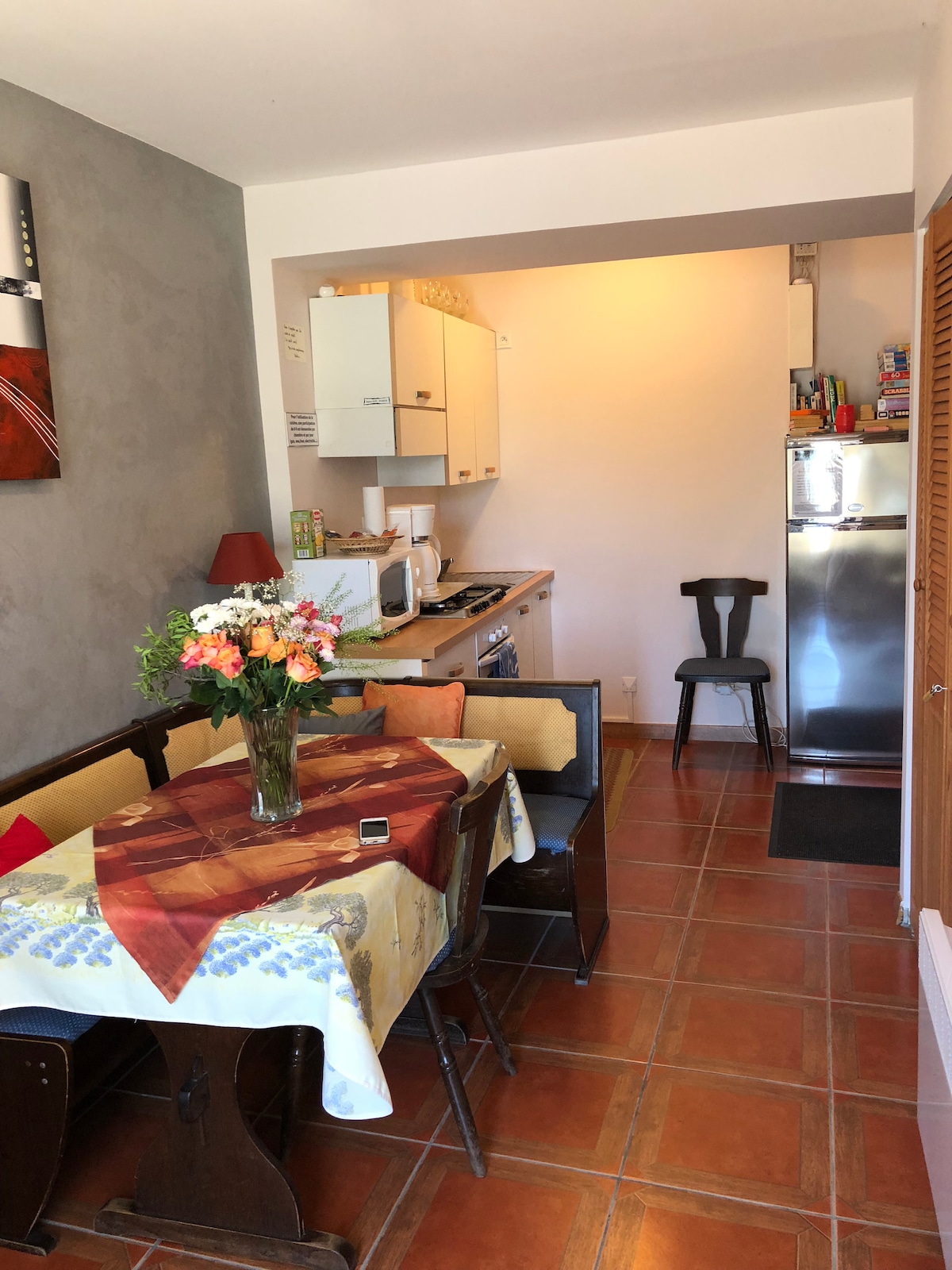 Studio refait à Neuf avec Terrasse. Capacité 1 Personne Emplacement au bord d'une petite rue peu passante Surface Salon Cuisine 12m² et Hauteur 1.80m / Mezzanine Chambre 8m² et Hauteur 1.55m. Au-dessus, se trouve une maison de 60m² et le salon se trouve en-dessous de la Mezzanine, risque d'entendre quelques bruits de pas. Attention accès Escalier Mansardé Si difficulté, possibilité d'utiliser le Canapé-lit du Salon. Petite Salle d'eau avec douche et WC Studio Climatisé. WIFI Inclus.