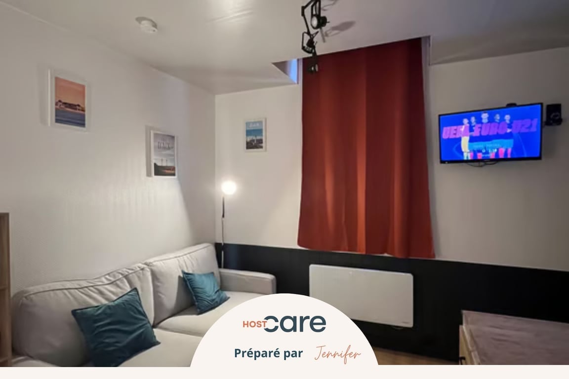 Notre studio de 24 m2, se trouve en hyper centre de Rochefort, à 10 minutes à pieds des thermes, à quelques mètres de la place Colbert et de la corderie Royale. Au RDC, très calme, bien que le studio donne sur la rue. Il est constitué d'une cuisine, plaques à induction, grille pain, bouilloire, Nespresso, frigo avec compartiment congélateur séparé. Le lit (160 x 200) est séparé du reste de la pièce par une cloison décorative. Notez qu'il n'y a pas de lave vaisselle.