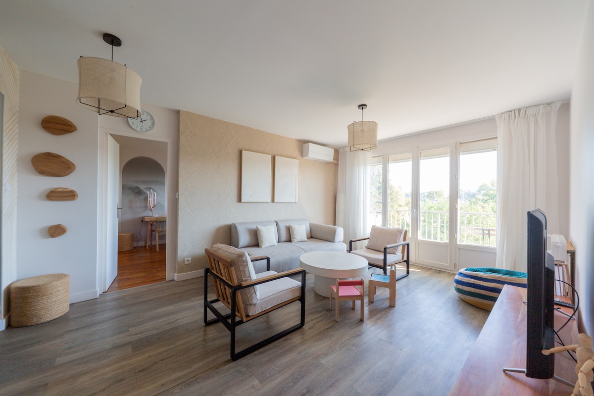 Ce havre de paix en pleine nature est idéal pour un séjour détente en famille. Niché sur les hauteurs de Couzon-au-Mont-d’Or, à seulement 10 km de Lyon, il offre une vue imprenable sur le Val de Saône et un accès direct à des sentiers de randonnée. À seulement 5 minutes à pied des quais de Saône, vous pourrez profiter d’un cadre naturel tout en restant proche de la ville. Pour vos moments de détente, vous aurez accès à Netflix ainsi qu’à une piscine au sel (sur demande), partagée avec nous.