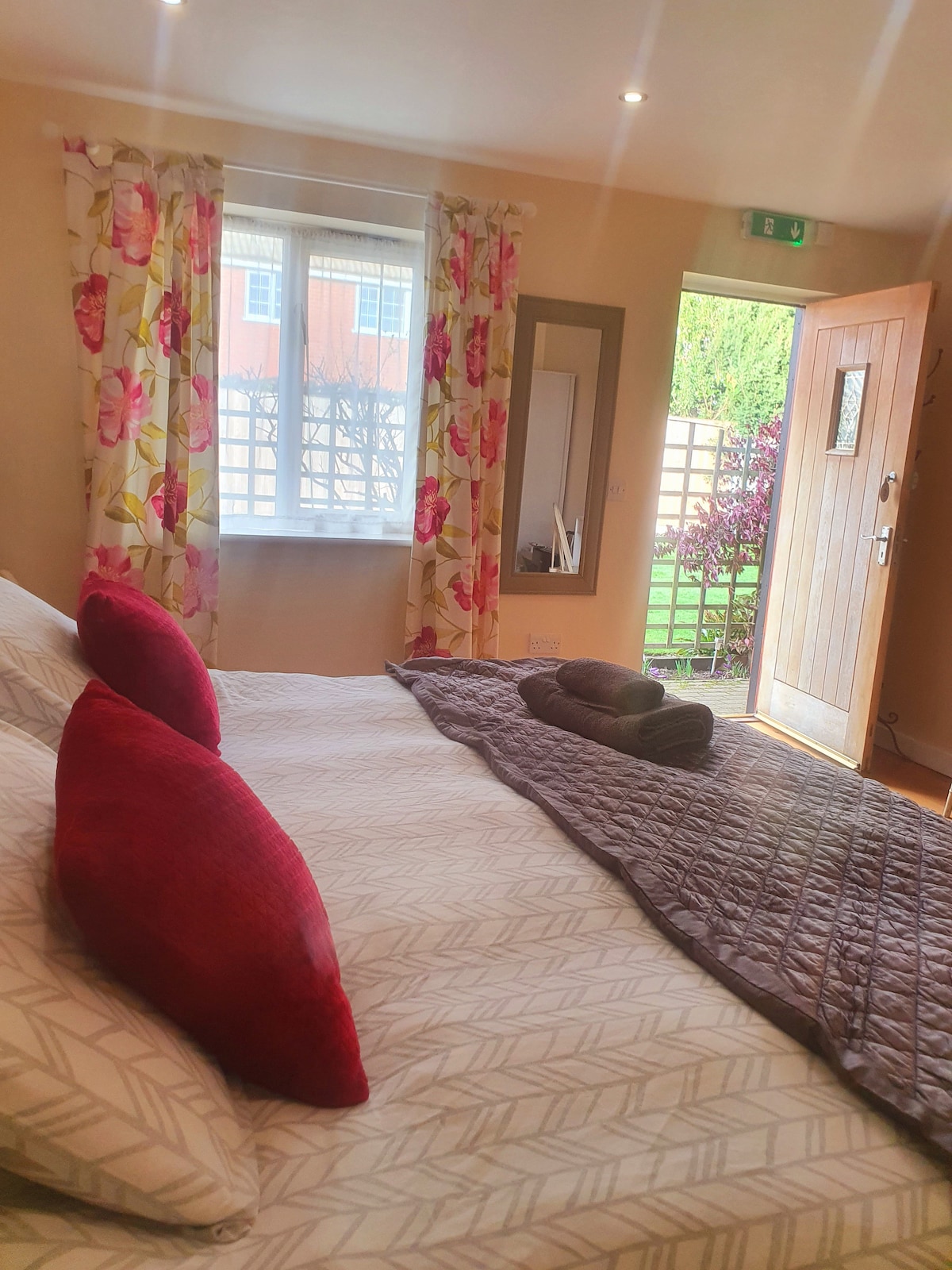 Our rooms are cosy comfortable and have side lamps for a soft ambience. Double beds in both rooms with memory foam comfort toppers. We have black out blinds at the double glazed windows. Brilliant views over Southend Airport runway perfect for plane spotting. We supply Tea and coffee making facilities, fresh water bottles, biscuits towels, earplugs, and fresh flowers in each room. We also include Free view T.V and Wi-fi. During the winter months the heating is set on a constant ‘warm’ setting