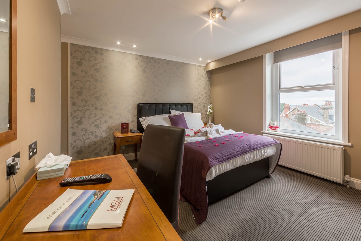 Spacious Family Room at ILFRACOMBE HOUSE HOTEL, with a double bed and a single bed, idefor families with one child, but a fold up bed can be added for the families with 2 children. Ensuite with a new fitted bathroom, all tiled and with shower. + Close to Adventure Island Funfair & all seafront amenities, + benefitting from half price Wristbands & Sealife bands + free Breakfast, + Wifi + Car Parking, + Bar & Restaurant Close to Cliffs Pavilion Theatre & Town Centre, Train Stations.