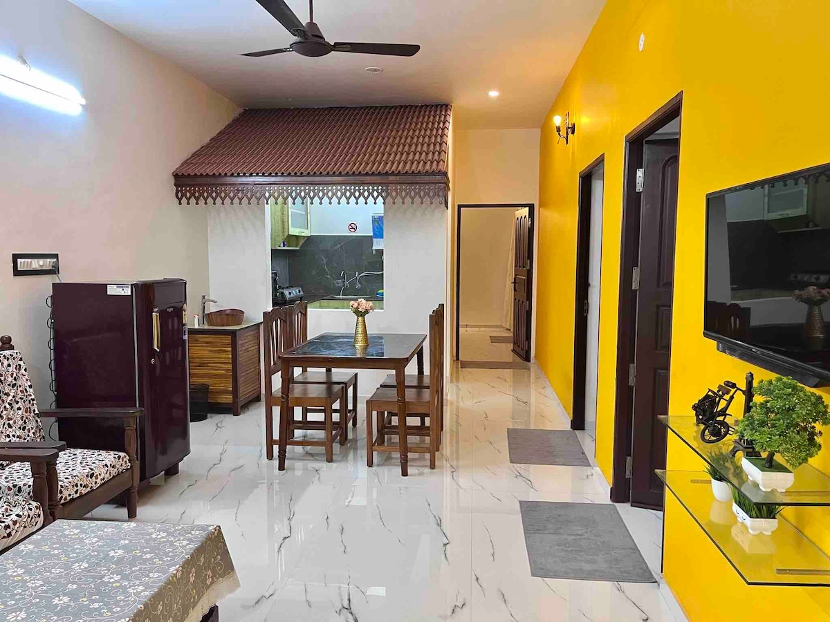 This 1 Bedroom Apartment at GF with a hall, functional kitchen, and attached bathroom is a fully private space with No sharing of any area. It is at walking distance from Promenade beach, Rock Beach, Ashram, White Town, market & good cafes. The Place is near the White Town and still close to nature and very peaceful surroundings. All the windows are facing huge green Ground. It has fully functional kitchen with utensils, Freeze, AC, Geyser, TV, High speed wi-fi. We need id proofs of all guests.