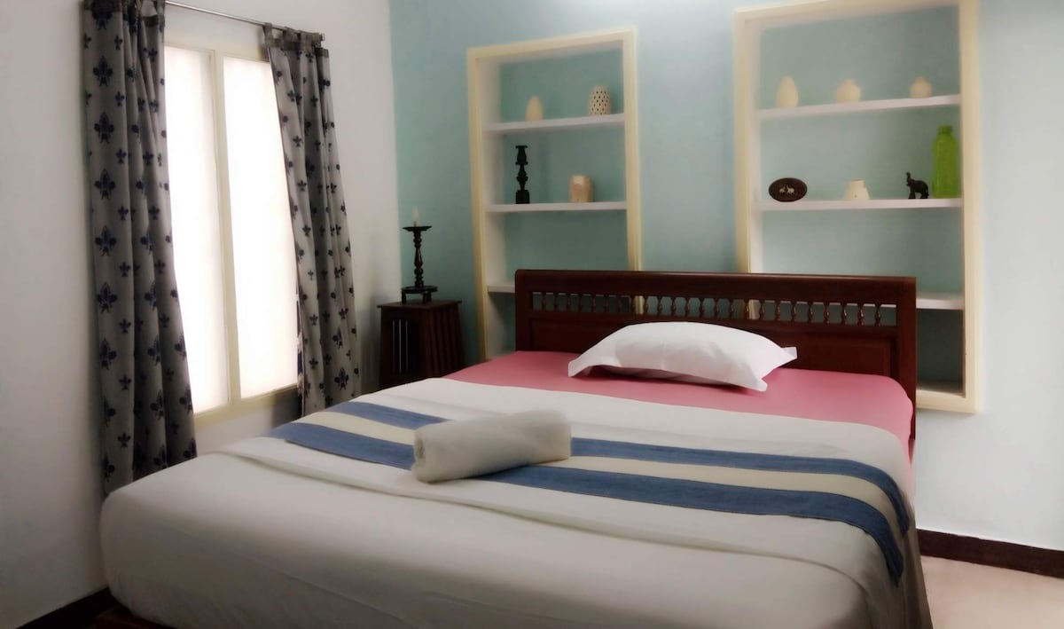 Centrally located in White town and 5 minutes walk to Rock Beach. The 1BHK Madhubani Art themed Apartment is an independent nest for a family of 3. A Full Size King Bed in the Bedroom and a Queen size Sofa Bed in the living room provides a comfortable stay for all 3 members. Full Kitchen, Washing Machine and a 4K television will meet most needs for long stays and provide complete independent living for short stay visit. Ample roadside parkings and 5 meters from bus stand you are well connected..