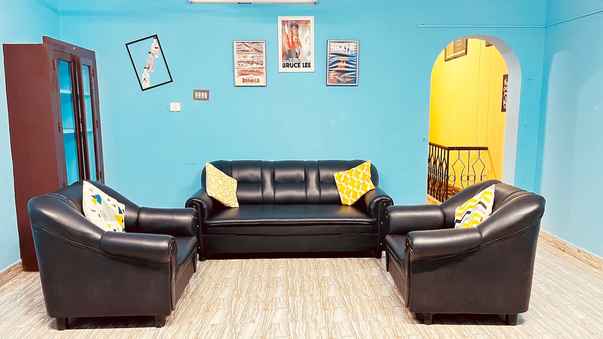 Luxury 4-bedroom, 2-floor holiday home near the beach in Pondicherry Ideal for friends, families, and large group stays 3 bedrooms on the first floor and 1 bedroom on the second floor Large sofa-cum-bed on the second floor 3 bathrooms for comfortable group living Spacious second-floor terrace for BBQ and gatherings Pool table, 100-inch projector with Dolby sound, and PlayStation 1000 Mbps high-speed Wi-Fi for workations Just 2–3 minutes walk to the beach, cafés nearby, bus stop outside