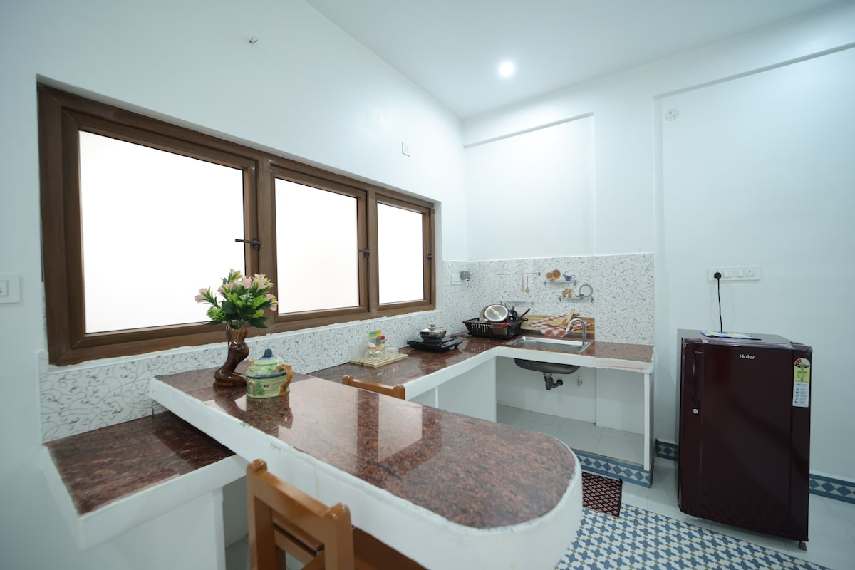 This 1 Bedroom Apartment at GF with a hall, functional kitchen, and attached bathroom is a fully private space with No sharing of any area. It is at walking distance from Promenade beach, Rock Beach, Ashram, White Town, market & good cafes. The Place is near the White Town and still close to nature and very peaceful surroundings. All the windows are facing huge green Ground. It has fully functional kitchen with utensils, Freeze, AC, Geyser, TV, High speed wi-fi. We need id proofs of all guests.