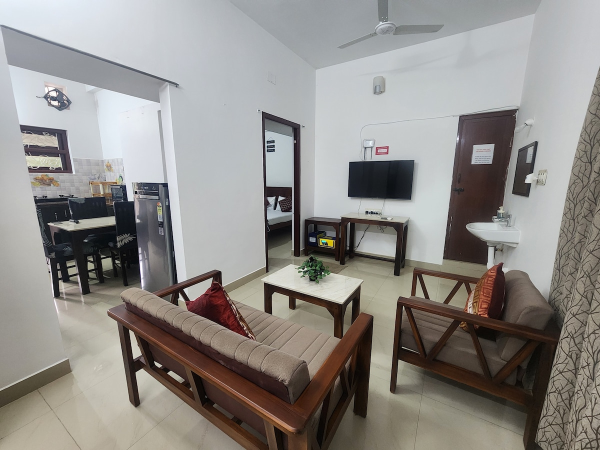 This 1 Bedroom Apartment at GF with a hall, functional kitchen, and attached bathroom is a fully private space with No sharing of any area. It is at walking distance from Promenade beach, Rock Beach, Ashram, White Town, market & good cafes. The Place is near the White Town and still close to nature and very peaceful surroundings. All the windows are facing huge green Ground. It has fully functional kitchen with utensils, Freeze, AC, Geyser, TV, High speed wi-fi. We need id proofs of all guests.