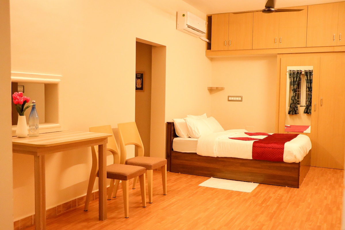 This is a compact, air-conditioned room located on the first floor. Perfect for solo travelers or couples, the room includes high-speed Wi-Fi and a smart TV for your entertainment. The room also features a private balcony overlooking a lively market street, offering a pleasant spot to relax and enjoy the view. Please note: Car parking and lift are not available. Nearby Attractions: Rock Beach – 5 mins drive / 15 mins walk White Town – 10 mins walk Sri Aurobindo Ashram – 10 mins walk
