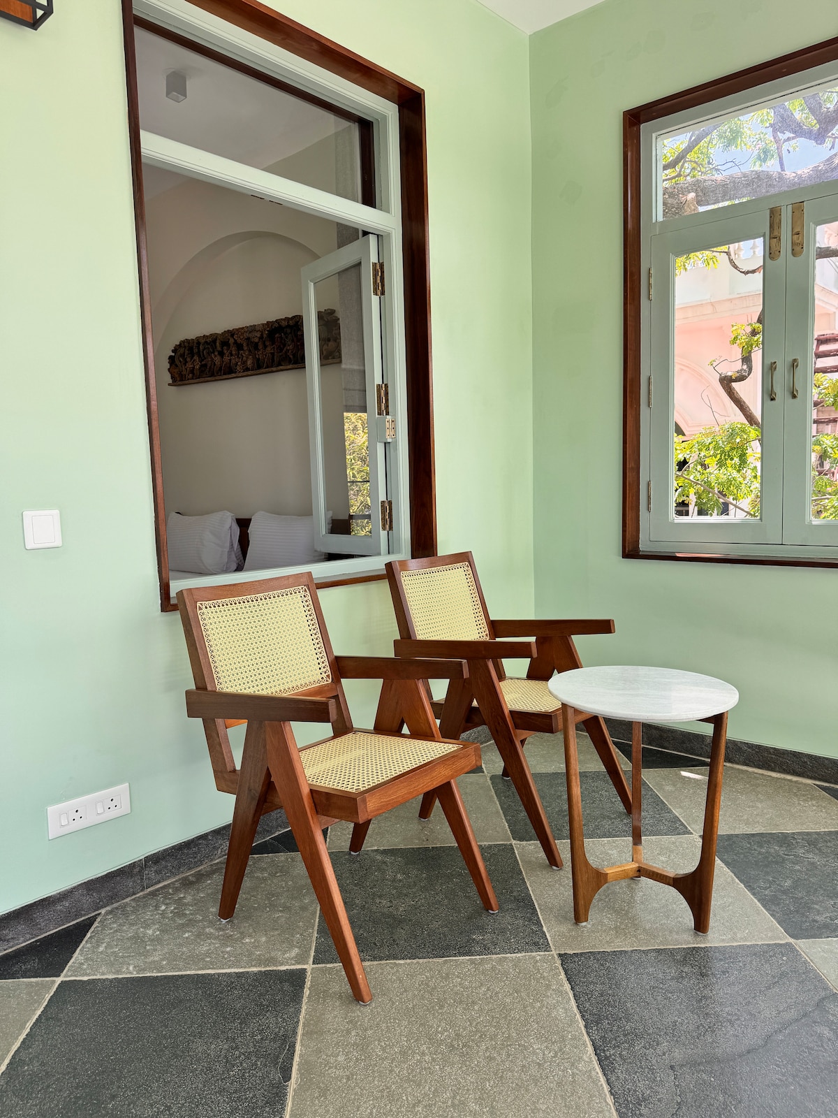 This Airbnb room showcases a unique and vibrant Chettinadu style, which is evident from its rich colors and traditional décor of South India. The standout feature is the backdrop behind the bed, which is creatively made from silk sarees, adding a personal and cultural touch. These sarees, bring an intimate and authentic feel, blending family heritage with traditional design. The room's walls are adorned with colorful frames and traditional artifacts. Overall welcome to a mesmerizing interior!!