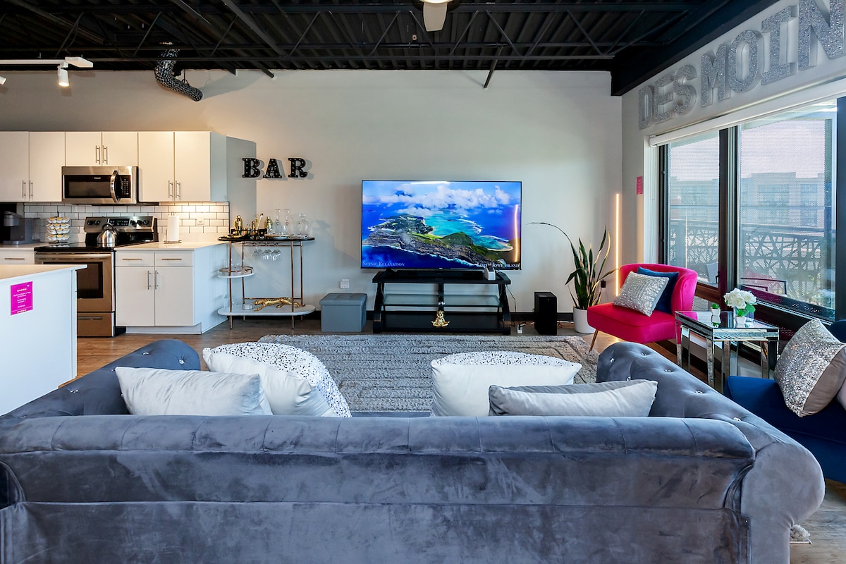 Welcome to The Lodge on 3rd - a massive 8000 sq ft Barndominum. Nestled in the heart of Des Moines, Iowa, this stunning retreat offers the perfect blend of rustic charm and modern elegance. With 3 spacious bedrooms and a large loft, there is plenty of room for you and your guests to unwind in style. This property is next door to Luxury Living on Third. airbnb.com/h/luxurylivingonthird These combined properties are ideal for family reunions, etc. ***$200 Pet Fee***