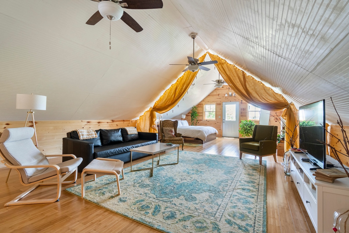 If there is one phrase that we would use to describe The Winery Loft, it is “attention to detail.” We spent over a decade building Le Petit Chevalier Vineyards and Farm Winery, and we are thrilled to open this unique experience up to guests! You can sleep where the rainbow ends! The Winery Loft features a spacious open floor plan, located on the second floor of our winery. Despite its openness, the loft is completely climate controlled, thoughtfully decorated and invites to simply relax.