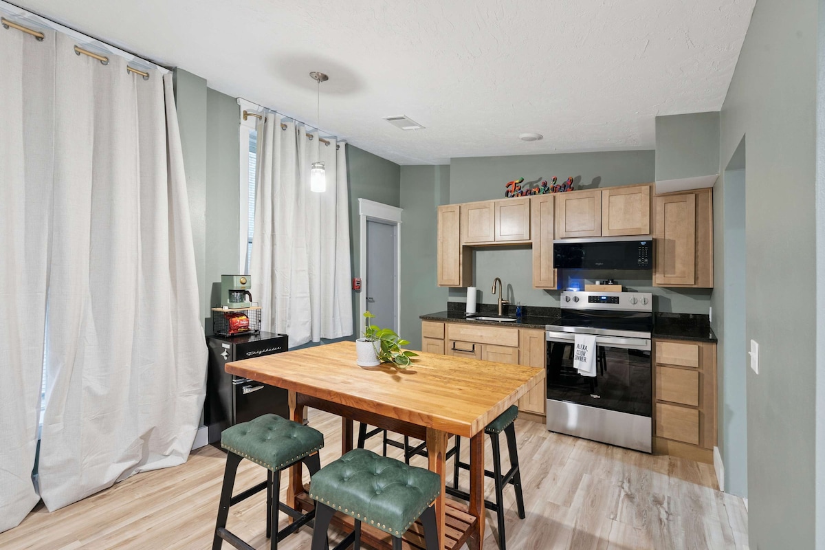 You are looking at a fully restored lower level 1,200sq ft apartment in the heart of downtown LeClaire. One large bedroom, one bathroom suite with walk-in shower, concrete countertops fully furnished vacation space with lots of vibe and charm. Built in the 1800s, the upstairs church area was converted into a music art space and the layout is consistent in the apartment. This is a clean, new, fresh space that is very comfy.