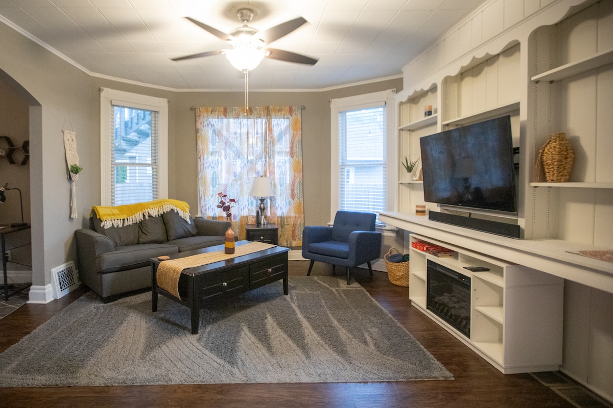 The ideal Moline landing! This cozy 2 bedroom, 2 full bathroom home offers ultimate comfort. Enjoy central AC, Samsung Smart TVs, a dedicated workspace, & 500Mbps internet. Features include an in-unit W/D, dishwasher, fully equipped kitchen, and a fireplace. Relax on the front porch with seating. Super cozy, it's perfect for small families, traveling pros, or quiet escapes. Minutes to downtown Moline, I-74/I-80, Mississippi River, and Ben Butterworth Park's stunning sunset views.