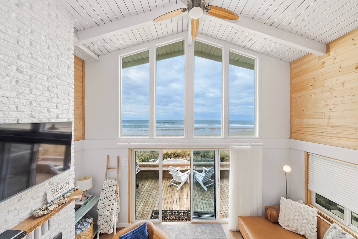 This spacious oceanfront Rockaway Beach vacation home features direct beach access, updated kitchen and bathrooms, private hot tub, and panoramic ocean views. The cozy sunroom and spacious open floor plan make this ideal for families and group getaways. Walk to local cafes and tourist shops in Rockaway Beach. Head out to deep waters with charter fishing services, hook up with a local guide for whale watching or kayaking. Or relax and enjoy the sandy beach.
