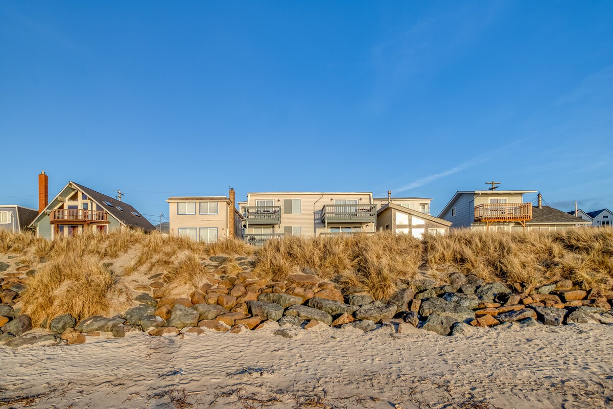 Stunningly situated 50 steps across the dune grass from the golden sand of Rockaway Beach, this oceanfront home provides a truly spectacular setting for your next escape to the Oregon Coast. In this gorgeous location just north of downtown, you'll be able to watch the ocean waves roll gently in and out from the elevated deck, enjoy the fully appointed and recently updated kitchen, and relax in the open living and dining space with a wall of picture windows out to the ocean.