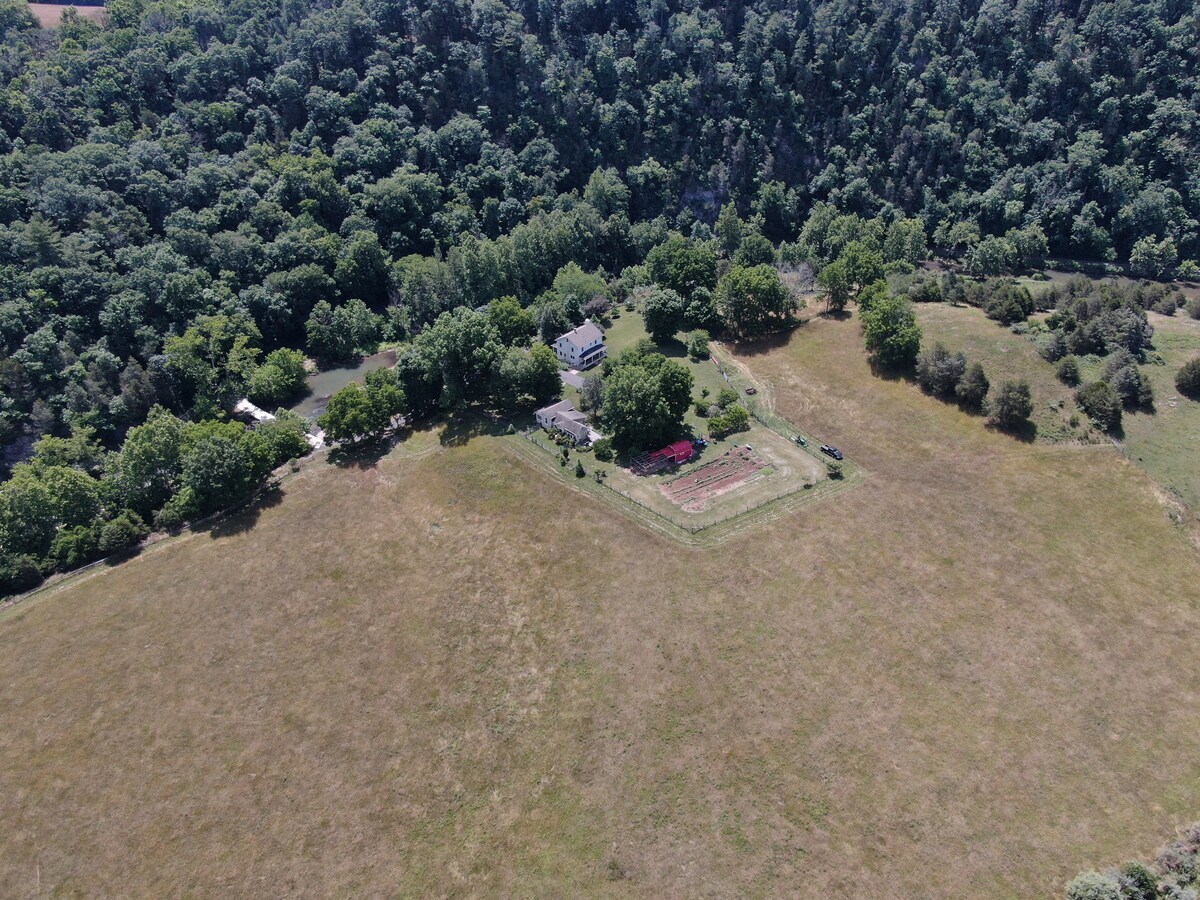 Wilderness area farm five miles from VMI and W&L in Lexington, Virginia. A natural spring fed creek runs through the property about 1/2 mile frontage- great for fishing which is available to guests. Fronts route 76 national bike route (Plank Road) a bikers paradise. Four mountain bikes available for guests. Spectacular natural views- fields, mountains, river and cliffs. Property include use of large outdoor spaces, decks, porches, fire pit and picnic tables. Dogs welcome!!