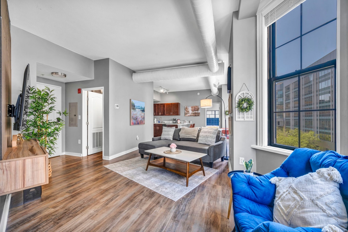 Experience the best of city living at our stylish 1-bedroom downtown Cleveland condo. This modern-organic space features 14-foot ceilings, hardwood floors, and large windows, creating a bright and airy atmosphere. Our condo includes 1 queen sized bed, and 1 couch. Located in the heart of downtown, you're steps away from top dining, shopping, and entertainment venues. Ideal for both business and leisure, our condo provides the perfect urban retreat. WALKING DISTANCE TO ALL CLEVELAND ARENAS!!