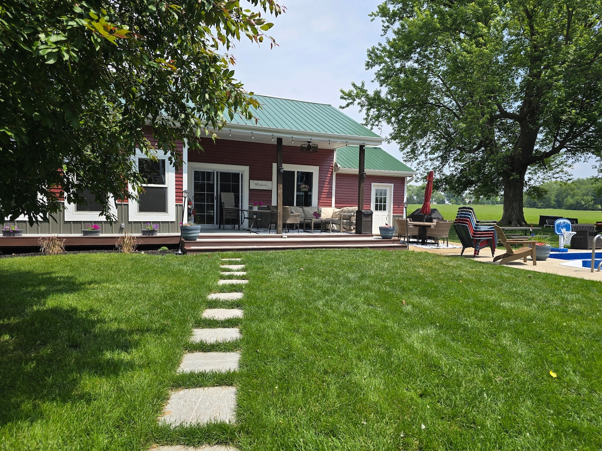 Enjoy a peaceful countryside retreat at this charming Barndominium set on 6.5 private acres, accommodating up to 8 guests This spacious getaway features an 18' x 36' private pool with a hot spa and a solar-heated pool room for year-round relaxation. The Great Room offers open-concept living with comfortable seating, recreation space, and four sleeper sofas. The cozy bedroom includes a king-size bed, while the fully equipped chef’s kitchen boasts an oversized island & a stove with an air fryer.