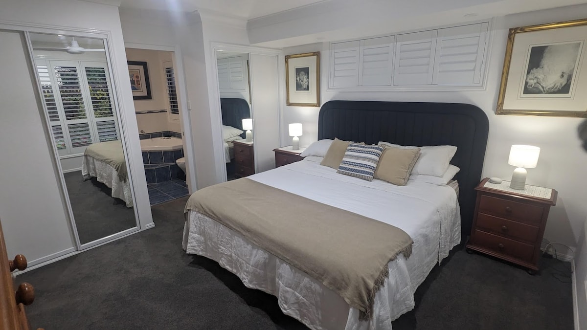 Relax in this beautiful self contained one bedroom unit featuring luxurious King bed, corner spa bath and quality finishings throughout. The garden setting is perfect for spotting the local bird life or dine outdoors with alfresco dining area. The unit is fully air conditioned for your comfort. Secure garage and fully equipped laundry. This stylish unit has everything you need for a comfortable stay. This is private residential accommodation only. No commercial activity is allowed.