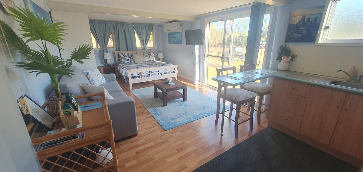 Take it easy at this unique and tranquil getaway. The 1 bedroom unit is on the ground floor of our farm house and easily accessible from main roads with undercover parking. Situated on a rural property only 5-8 minutes to the coastal towns of EMU PARK and YEPPOON beaches, the self-contained unit is cosy and inviting. Sit back on the covered outdoor area with a beverage, overlooking the property and dam, and bask in the serene sounds of the country, beautiful sunsets, farm animals and wildlife.