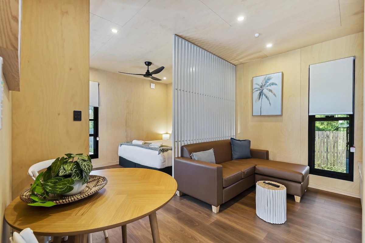 Modern airconditioned studio apartment with Queen bed and extra double mattress sofa bed made up on request. Short walk to beautiful local beaches, free lagoon pool and great restaurants 15 mins walk away and cute coffee shop + fish’nchips in Cooee bay. Off street undercover parking, Smart TV, WIFI, private bathroom and self contained kitchenette with new appliances. Access to laundry and back garden with BBQ . Pet and child friendly. Large elevated front deck.