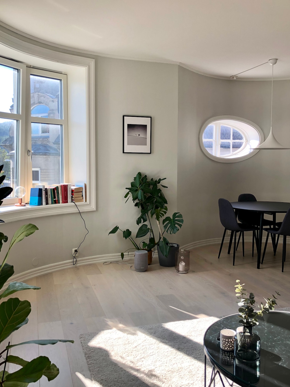 Leiligheten ligger i tredje etasje. Perfekt plassert med ca. 5 minutter gange til Trondheim Torg, Øya/Nidelven, og til sjøen. Innvendig er den unikt utformet med buet vegg og ovalt vindu i stuen. 66 kvm, romslig med høyt under tak og 17 kvm soverom. God størrelse på bad. Innredet med en blanding av klassisk retro møbler og moderne møbler. Stuen har fin utsikt mot Steinåsen. Utmerket tilgang til kollektivtransport, med kort busstur til eksempelvis Bymarka eller Solsiden.