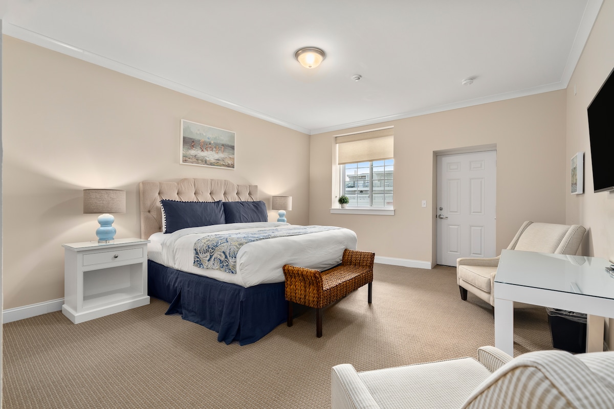Your winter coastal getaway awaits! ❄️⚓ The Grand Suite, a luxurious retreat at Cutwater Inn & Suites. This spacious 475 sq. ft. main-floor suite offers a king bed, queen sofa-bed, and kitchenette. The only suite with a shower & tub, and a private outdoor patio. Comfort, style, and fresh sea air await! ☀ Steps to Newburyport’s shops & restaurants 🌊 5-min walk to the waterfront 🍷 Surrounded by local dining & boutiques 🚉 10-min drive to the Newburyport train station 🅿 Nearby public parking