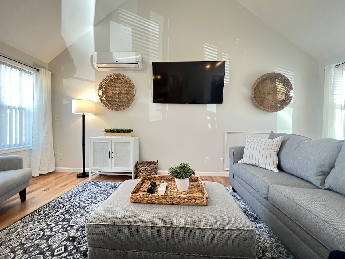 Kick back and relax in this calm, stylish, quiet space w easy parking. Walk/bike to the beach. Enjoy your private space with dining area, sofa, queen bed and private bath. The space is over 600 sq ft with plenty of sunshine -- all built in last 2 years. Visit the shops & cafes of Portsmouth. Clean, bright, and private space suitable for a couple. Two bikes & beach chairs. We are a little more than a mile from the beach and an easy drive to NH/Maine sites.