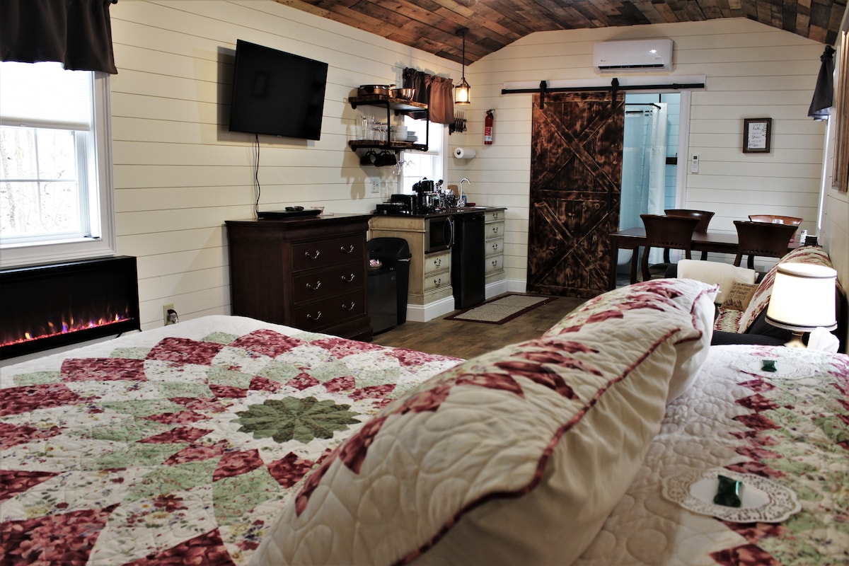 This peaceful cottage has a rustic, yet modern feel to it. It is set on the edge of a wooded area with plenty of wildlife to enjoy, near Massanutten Resort. Enjoy the ambiance of the small electric fireplace, well-equipped kitchenette and dining area, or the front porch swing. The bathroom features an old-fashioned claw foot tub, fitted with a shower head. Enjoy a complimentary bottle of sparkling cider and a basket of snacks with your stay. We look forward to extending our hospitality to you.