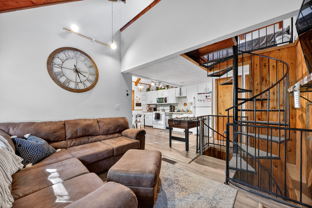 🔥Huge game room; ping pong, Ms. Pac Man, Simpsons, Pop-A-Shot basketball, dartboard & exercise bike 🔥4 bedrooms including dual king master bedrooms with ensuites (1 on main floor, 1 on lower level) 🔥Sparkling hot tub & sauna on private deck 🔥2 family rooms; Infinity game table (electronic board games for all ages!), 65" smart TVs, board games, fireplaces 🔥Fully loaded kitchen 🔥Dual bunk room with kids toys 🔥High speed WIFI 🔥Discounts for stays over 4 days 🔥2 min to water park