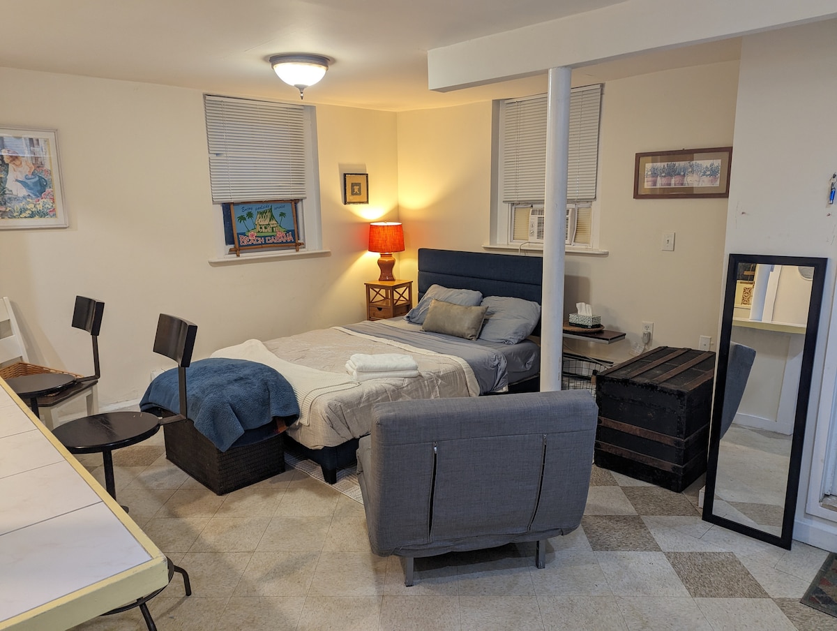 Quiet & cozy suite, with a comfortable full bed & private bathroom in newly renovated garden (basement) level of a single-family home. WiFi/air conditioning & heat unit/FiOS cable - roku TV. Coffee/tea available. Rollaway available for an extra bed. The neighborhood is quiet, and parking is available in the driveway. Feel free to come and go as you please -- we hope our guests feel like this is their home away from home:)