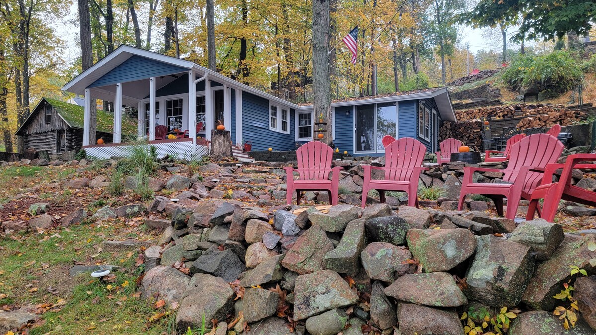 Make wonderful memories on pristine Walton Lake. 1 hr from NYC . This ALL INCLUSIVE Waterfront Cabin is like a mini resort! Rustic, rugged, off grid feel yet 2 miles from town. It has 2 docks, over water hammock & fire pit🔥. Enjoy sunsets on the covered porch & deck. Fish, & look for bald eagles🦅 Hungry? Paddle🛶 across the lake for tacos🌮 & drinks🍸. Inside has retro & antique decor, modern appliances, fireplace♨️, & strong WIFI. Includes COMPLIMENTARY Firewood, NO CLEANING/PET FEES🐕