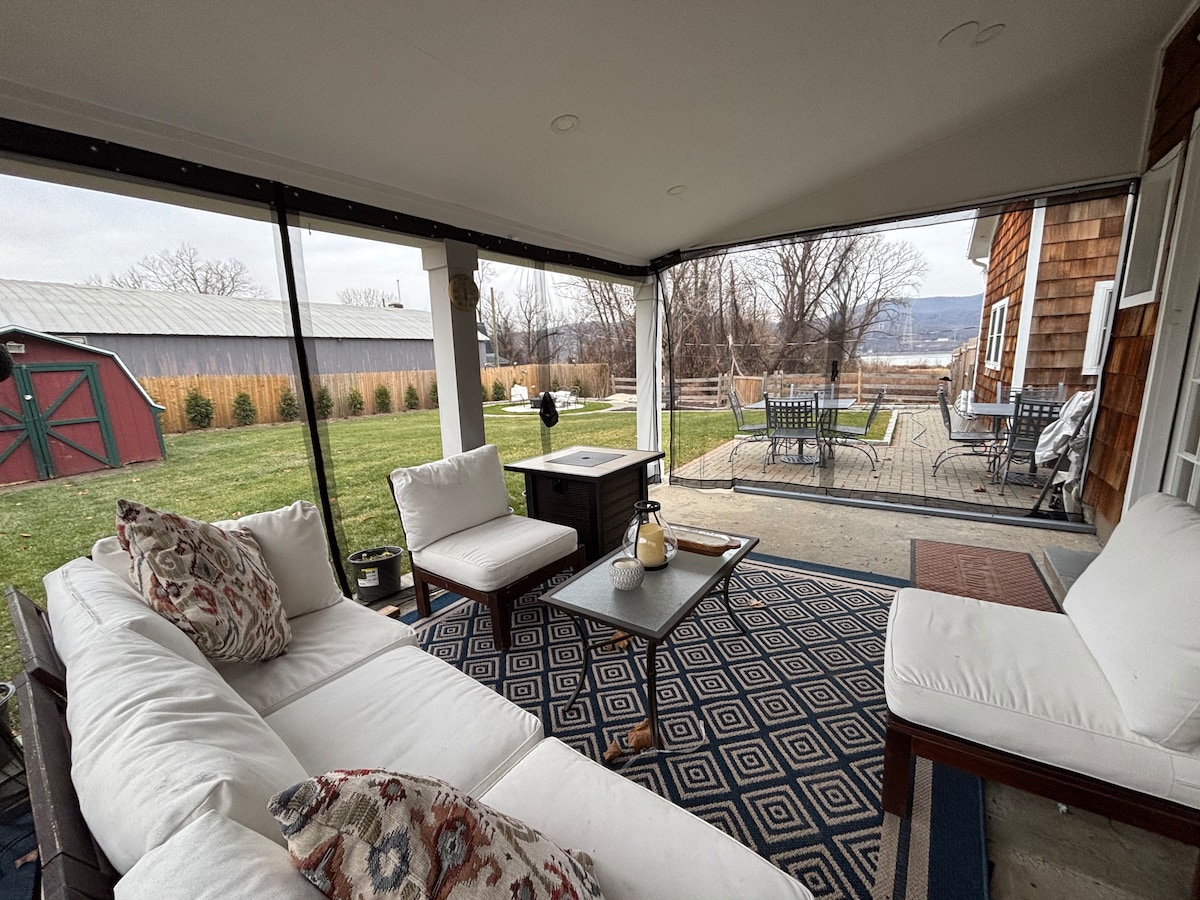 Welcome to your private upstairs retreat with its own private entrance and bathroom. This charming efficiency offers a queen bed for restful nights, plus a loveseat sleeper sofa perfect for an adult or two small children. Enjoy the convenience of a mini fridge, coffee maker, and microwave. Step outside your door to our porch sitting area with a grill. Thoughtfully set up to feel both private and inviting, it’s a peaceful space to relax, recharge, and feel right at home during your stay.