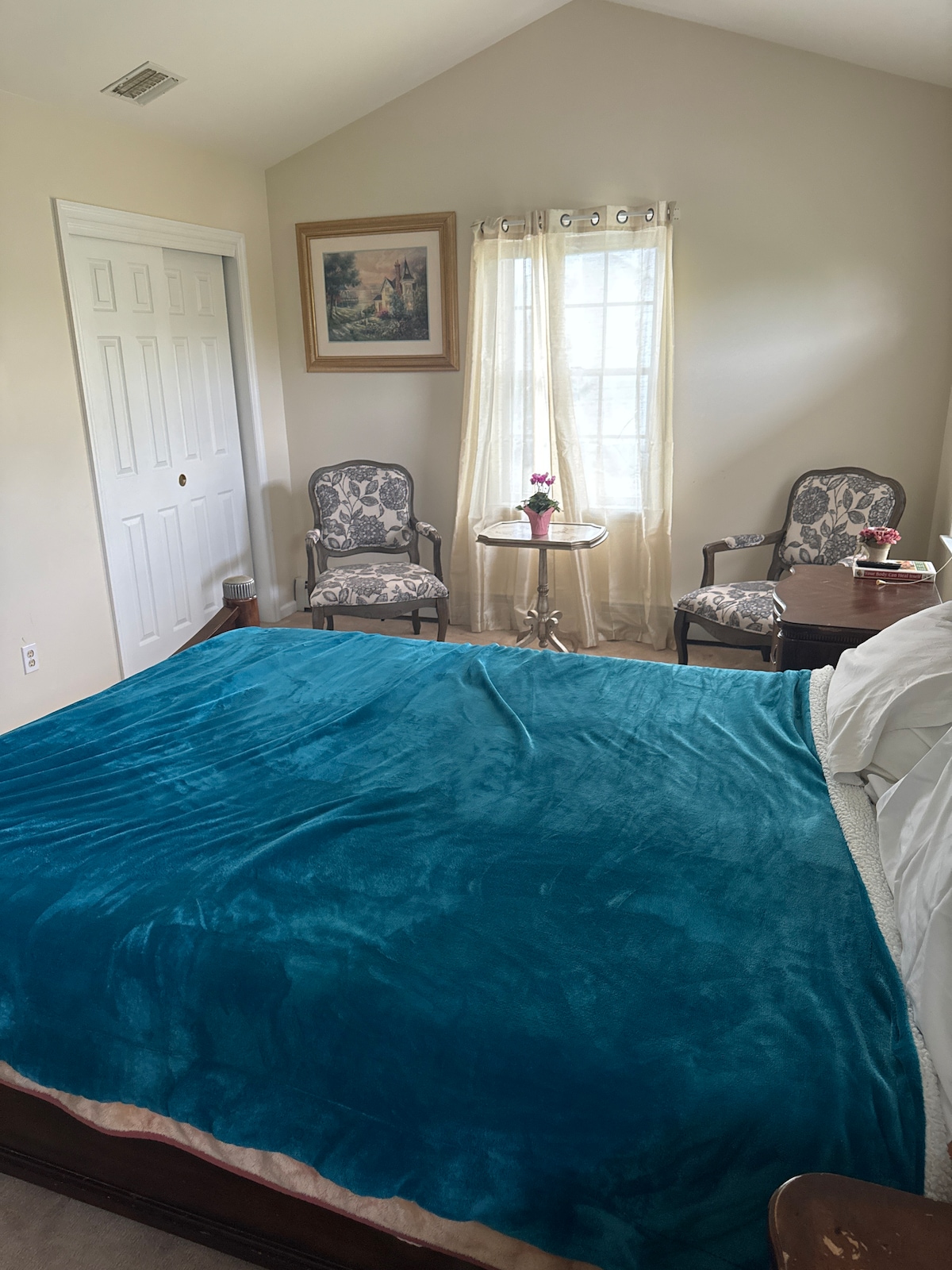 Welcome to your private upstairs retreat with its own private entrance and bathroom. This charming efficiency offers a queen bed for restful nights, plus a loveseat sleeper sofa perfect for an adult or two small children. Enjoy the convenience of a mini fridge, coffee maker, and microwave. Step outside your door to our porch sitting area with a grill. Thoughtfully set up to feel both private and inviting, it’s a peaceful space to relax, recharge, and feel right at home during your stay.