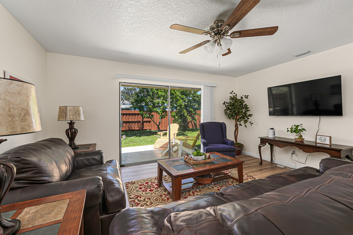 This beautiful pool home has all you need to enjoy a fun and exciting Space Coast vacation. Conveniently located just 9 mi (15 min) to Beaches & Cruise Terminals, 3 mi to Historic Cocoa Village shops and restaurants. 23 mi to Kennedy Visitor Center, 35 mi to Orlando International Airport and 8.2 mi to USSA Sports Complex and Stadium. Sip a cold beverage while lounging poolside under a palm, a hammock or relaxing shaded cabana. Enjoy HEATED POOL, BBQ grill, fire pit, games, and a giant 72” TV