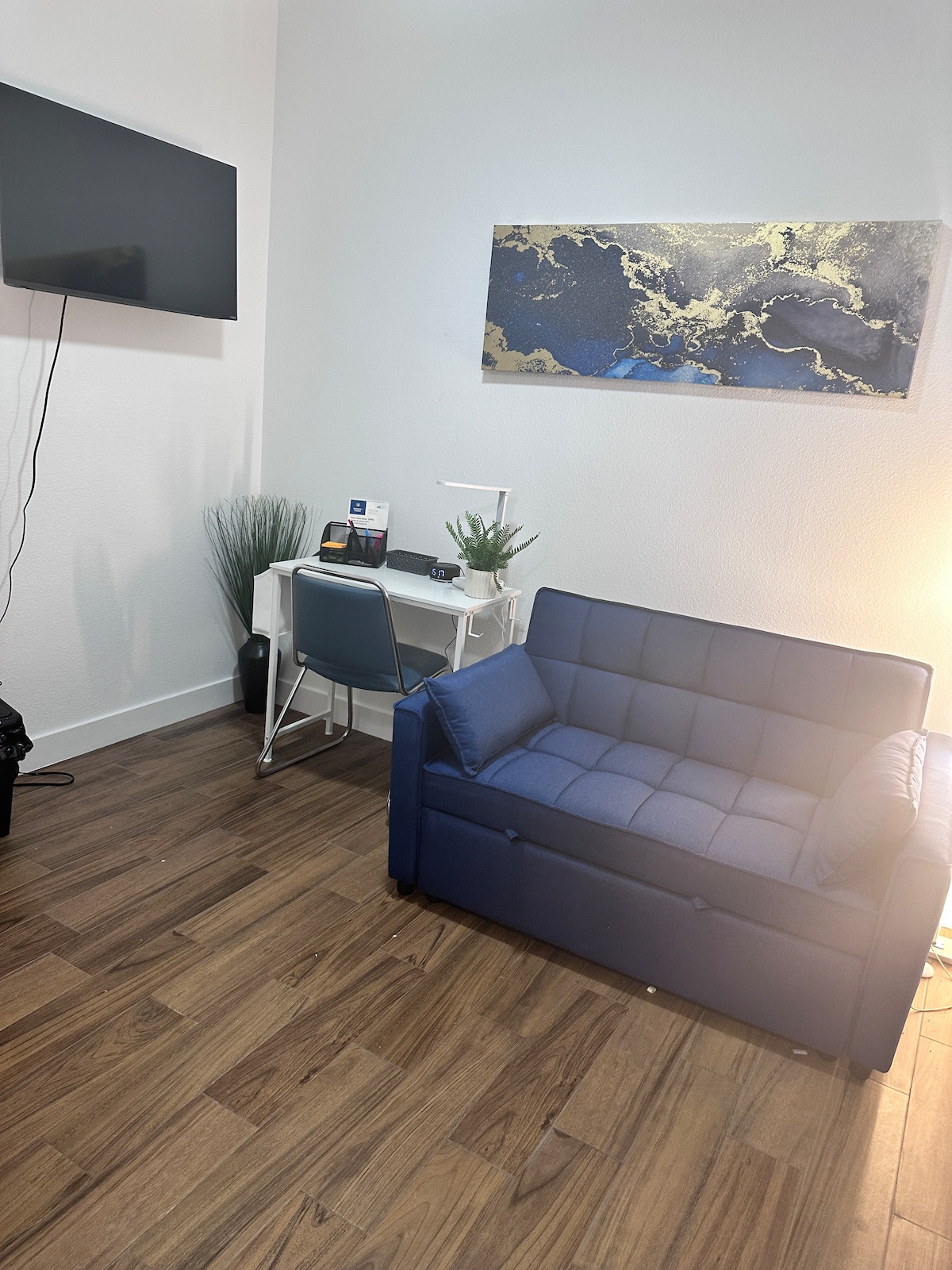 This private suite has a separate entrance with screen door, kitchenette & bathroom. The Bedroom has a full size bed with quality linens and a 4” Memory Foam topper, fireplace, ceiling & floor fans, t.v., futon & closet. Kitchenette offers the essentials, electric hot pot & skillet, small refrigerator, sink with garbage disposal & microwave/air fryer oven. The “spa-like” bathroom boasts an overhead rain shower head & removable wand combo, a teak bench, shower essentials & fresh linens.